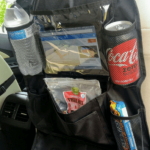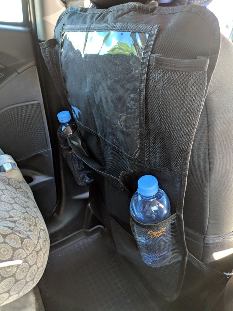 We have used these several times in roadtrips and around town. They hold A LOT and secure in place very easily. When it’s daylight, there is a reflection through the plastic for the tablets, but…. you can either put them in with case inside and just leave the tablet hanging outside. It holds 4 bottles/cans and multiple pockets for snacks/earbuds/books/whatever you can find to stuff in them… LOVE THEM!