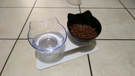 This pet feeder is very small and cute, and it is very practical and durable. The elevated bowl is designed to release pressure from your cat’s neck, making him more comfortable and happy while enjoying his food. At least, for my two black kittens it works.