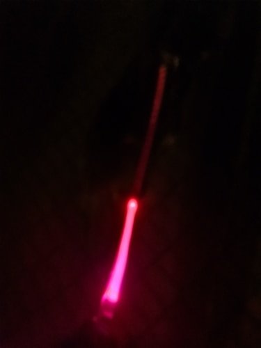 works great–very visible. It’s a little stiff so it’s not as discreet from the dog’s perspective as a nice thin leather leash. The stiffness occasionally causes it to pop up in front of my dog, making her want to chew it. Glad I have it for those wintertime evening walks. I’ve used it many times over the last few weeks and have not had to charge it yet.