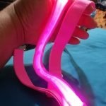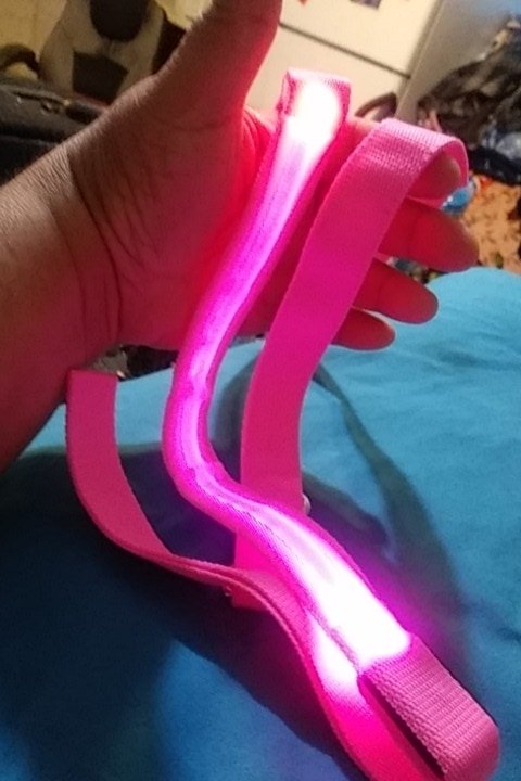I bought two of these leashes; one for each of my dogs in neon orange and yellow. Both leashes look bright and vibrant during the day even when they’re not turned on which I love. During the night, both colors (yellow and orange) are clearly visible – the yellow shines more of a green when turned on but i’m fine with that. I got many compliments on the leashes! It has a soft padding for your wrist and grip of the leash as well.