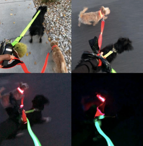 This leash is extremely bright and visible. I love the fact that it’s non-tangle. It also holds a charge for a long time. The dogs don’t even seem to notice the lights. When I was using it recently, a man who saw it from about 50 feet away said, “Boy, if you can’t see that . . . .”