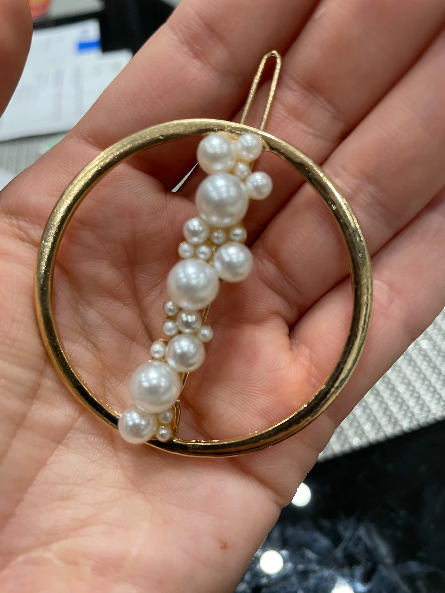 This stunning Faux Pearl Hair Clip has a lovely golden tone and is decorated with faux pearls. Size: 2.6 in.*2.6 in. Weight: 0.5 oz.
